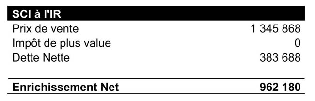 Contrairement au cas précédent, la SCI à l’IR permet de dégager 962k€ à la revente contre 679k€ pour la SCI à l’IS soit un delta de 283k€.